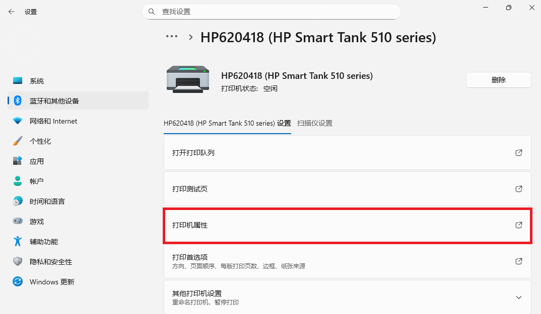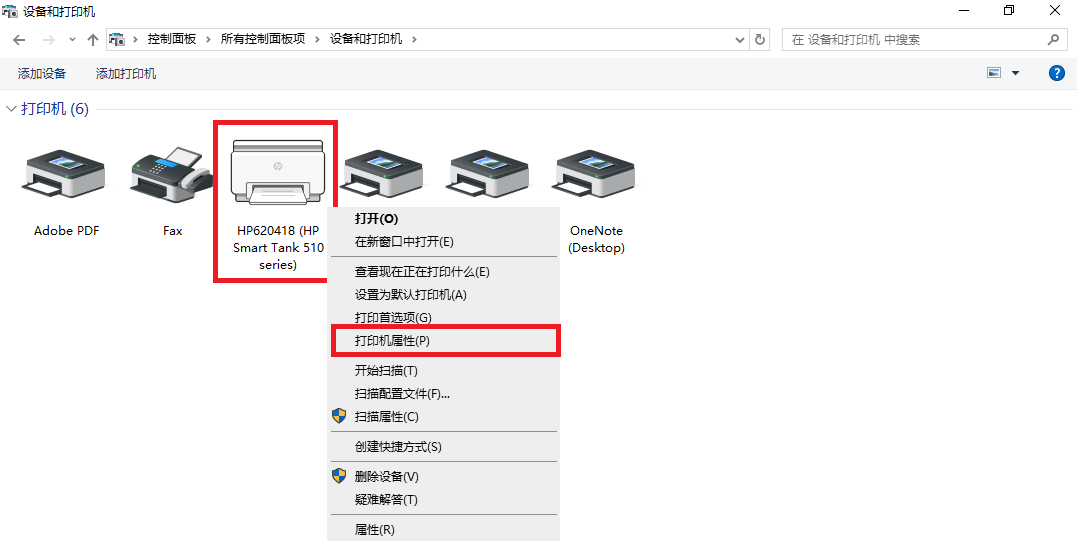 找到并选择 HP Smart Tank 510 打印机图标->右键->选择