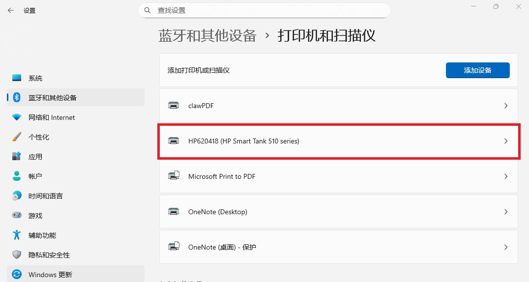 蓝牙和其他设备->选择打印机和扫描仪。选择